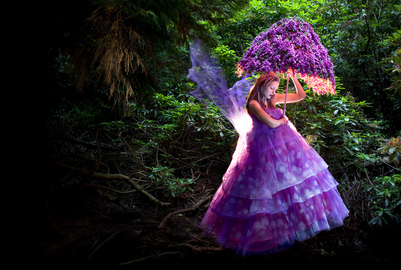Earlier in the day Charlotte had sewn some extra lengths of the purple net to the back of the dress, and just at this point she threw them up into the bush behind Helen. On camera, because of the slow exposure I was using, this resulted in strange ghostly blurred wings. It was complete luck, but became the making of the picture. To be honest I was in complete shock. Minutes before, everything had been descending into a dark, dull, nightmare and now I was faced with a real life, levitating fairy! The relief flooded through me as I kept staring at the back of my camera transfixed by the preview. It looked like we had caught a life-sized firefly hovering through the woods; I was spellbound! We had managed the shot with minutes to go before night finally swallowed our little set. Exhausted, we packed up our kit and returned to the cars by the lights of our phones, triumphantly shouting and groaning under the weight of carrying the generator. It was another battle won against the English weather. I was so happy, wired and thrilled that once again, despite all the odds, we’d captured something wonderful.